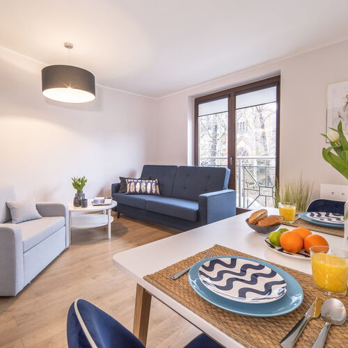Komfortowy apartament usytuowany na 3 piętrze sopockiej inwestycji ma możliwość zakwaterowania 3 osób. Przestrzeń apartamentu oferuje przestronny salon z aneksem kuchennym oraz łazienkę z prysznicem. Apartament wyróżnia się przyjemnym i estetycznym wystrojem oraz funkcjonalnością. Część dzienna wyposażona w wygodną sofę, rozkładany fotel i TV stanowi doskonałe miejsce wypoczynku i relaksu. Dodatkowo w pełni wyposażony aneks kuchenny umożliwia przyrządzenie posiłków. Nowoczesny design oraz kompleksowe wyposażenie w niezbędne akcesoria kuchenne oraz łazienkowe gwarantują komfortowy i wyjątkowy pobyt w samym centrum Sopotu.