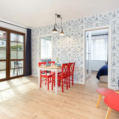 Wygodny i przestronny apartament z możliwością zakwaterowania 6 osób składa się z salonu z aneksem kuchennym, dwóch sypialni oraz łazienki z prysznicem. Przestrzeń salonu wypełnia rozkładana sofa, a sypialni - wygodne łóżka. Jasny i morski wystrój apartamentu oraz wysokiej jakości wyposażenie gwarantują komfortowy pobyt. Apartament posiada taras wyposażony w meble ogrodowe, który stanowi idealne miejsce wypoczynku na świeżym powietrzu. Kompleksowe wyposażenie apartamentu, TV z usługą Netflix, dostępność sieci WiFi oraz niezbędne akcesoria kuchenne i łazienkowe zapewniają niezapomniany pobyt w nadmorskim otoczeniu. Do dyspozycji gości jest prywatne miejsce parkingowe przed budynkiem, co stanowi atut szczególnie w sezonie turystycznym.