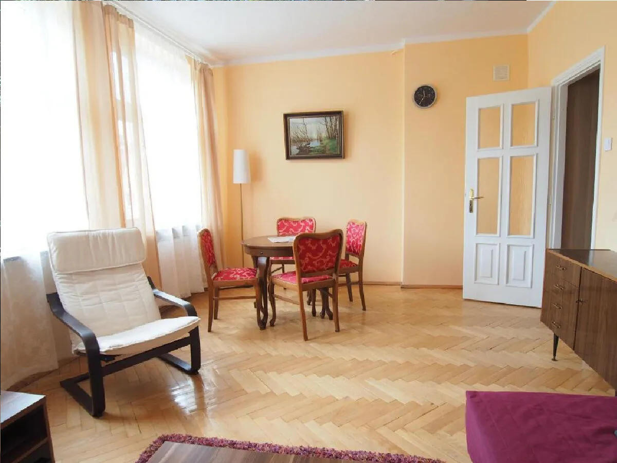 Mieszkanie składa się z dużego słonecznego salonu z rozkładaną sofą dla 2 osób , częścią jadalną i wypoczynkową. W sypialni łóżko małżeńskie. Osobna kuchnia z pełnym wyposażeniem : cztero- palnikowa kuchenka z piekarnikiem , lodówka z amrażalnikiem, zmywarka do naczyń. Łazienka z prysznicem. W łazience znajduje się pralka .