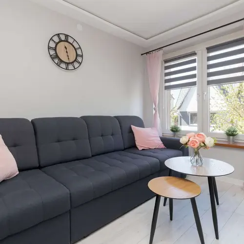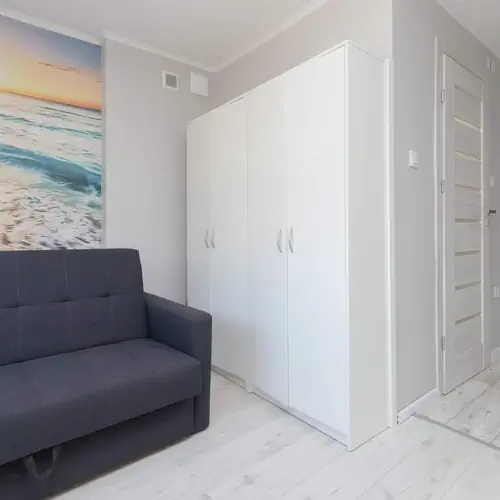 Przytulne studio zlokalizowane na pierwszym piętrze to doskonały wybór dla osób ceniących wygodę, nowoczesny design oraz bliskość nadmorskich atrakcji. Przestrzeń została zaprojektowana z myślą o wypoczynku zarówno dla par, rodzin z dziećmi, jak i grupy przyjaciół – maksymalnie pomieści cztery osoby. Jasne wnętrze o neutralnej kolorystyce, przełamane stylowymi akcentami w odcieniach czerni, różu i naturalnego drewna, tworzy atmosferę harmonii i relaksu już od pierwszych chwil po przekroczeniu progu. W części wypoczynkowej znajdują się dwie komfortowe, rozkładane sofy, które pełnią funkcję zarówno miejsca do dziennego relaksu, jak i nocnego wypoczynku. Studio posiada w pełni wyposażony aneks kuchenny, który umożliwia przygotowanie zarówno prostych śniadań, jak i bardziej wymagających posiłków. Do dyspozycji gości jest płyta grzewcza, lodówka, czajnik elektryczny, komplet naczyń i sztućców – wszystko, czego potrzeba podczas wakacyjnego pobytu. Przy części jadalnianej ustawiono stół z wygodnymi krzesłami, tworząc przyjemną przestrzeń do wspólnych posiłków. Nowoczesna łazienka to kolejny atut apartamentu – wyposażona została w przeszkloną kabinę prysznicową, toaletę, umywalkę z lustrem i miejsce do przechowywania, a także eleganckie dodatki w czarno-złotej kolorystyce, które nadają jej hotelowego charakteru. Goście mają zapewniony komplet świeżych ręczników oraz zestaw kosmetyków pielęgnacyjnych. Na wyposażeniu apartamentu znajduje się także telewizor z płaskim ekranem i funkcją SmartTV, który umożliwia korzystanie z ulubionych platform streamingowych. Bezpłatne, szybkie WiFi dostępne jest we wszystkich pomieszczeniach, co umożliwia zarówno pracę zdalną, jak i wygodne planowanie lokalnych atrakcji online. Obiekt jest przyjazny zwierzętom, dzięki czemu można cieszyć się pobytem w towarzystwie pupila.