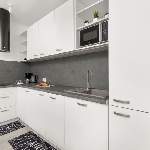 Jasny i przytulny apartament typu studio jest idealne na pobyt dla maksymalnie czterech osób. Miejsce jest klimatyzowane. Główne pomieszczenie to salon, w którym znajduje się wygodne łóżko małżeńskie, rozkładana sofa, biurko idealne do pracy zdalnej oraz telewizor zapewniający rozrywkę. W części jadalnej usytuowany jest stół z czterema krzesłami, co zapewnia komfortowe warunki do spożywania wspólnych posiłków. Aneks kuchenny został zaopatrzony w niezbędne sprzęty, oferując wszystko, co potrzebne do przygotowywania potraw. Znajduje się tu lodówka z zamrażarką, płyta indukcyjna, czajnik elektryczny, kuchenka mikrofalowa oraz wszelkie niezbędne naczynia i przybory kuchenne. Łazienka została w pełni wyposażona w prysznic, toaletę oraz pralkę, co czyni to studio idealnym miejscem na dłuższe pobyty. Dodatkowo do apartamentu przynależy miejsce parkingowe w garażu podziemnym. To jasne i komfortowe mieszkanie jest idealne miejsce dla osób, które cenią sobie wygodę i funkcjonalność.