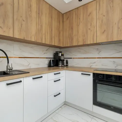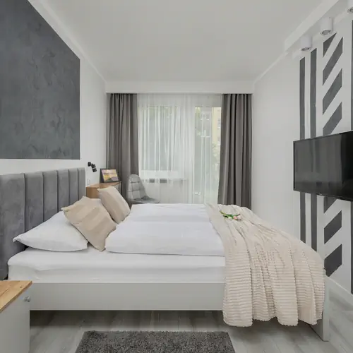 Stylowy apartament o powierzchni 46 m² może ugościć 4 osoby. Jego funkcjonalne wnętrza sprawią, że Państwa pobyt będzie niezwykle komfortowy. Apartament urządzono w modnych kolorach, z dużą ilością bieli, jak również szarych i drewnianych elementów. Złożony jest on z salonu, sypialni, aneksu kuchennego, łazienki oraz balkonu. W salonie znajduje się elegancka rozkładana sofa, stolik kawowy, nowoczesny telewizor z funkcją SmartTV oraz stół z krzesłami. Osobna sypialnia wyposażona została w wygodne łóżko małżeńskie, drugi telewizor oraz szafki nocne. Aneks kuchenny został wyposażony we wszystkie przybory, niezbędne do przygotowywania posiłków. Znajdują się w nim takie udogodnienia jak ekspres do kawy, piekarnik, zmywarka czy lodówka z zamrażarką. Nowoczesna łazienka wyposażona jest w kabinę prysznicową, suszarkę do włosów, pralkę i ręczniki dla naszych Gości. Z umeblowanego balkonu widać wewnętrzny dziedziniec, z dużą ilością zieleni. Można tutaj zrelaksować się przy filiżance ulubionej kawy. Dodatkowo do apartamentu przynależy zamykana rowerowania znajdująca się w budynku. Apartament będzie znakomitym miejscem na rodzinny wyjazd do Świnoujścia, a nasi Goście będą mogli poczuć się tutaj naprawdę wyjątkowo.