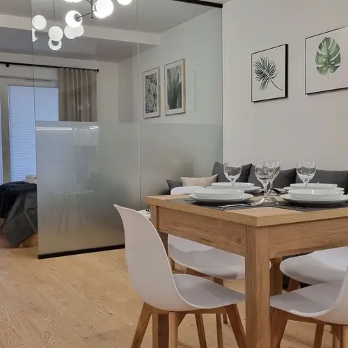 To wyjątkowe, gustownie urządzone studio o powierzchni 43 m² zapewnia komfortowe zakwaterowanie dla 4 osób. Układ pomieszczeń obejmuje salon z aneksem kuchennym oraz łazienkę z prysznicem. Nowoczesne wnętrze, w którym estetyka idzie w parze z funkcjonalnością, może nie tylko cieszyć oko, ale także zapewnić komfort i wygodę podczas pobytu. Przytulny salon w jasnych kolorach jest elegancki, ale też wyjątkowo przyjemny. Dobrze dobrane oświetlenie i miękkie tekstylia dodatkowo podkreślają atmosferę relaksu i spokoju. Miękka sofa z funkcją spania zapewnia spokojny sen i relaks po dniu pełnym wrażeń. Oddzielona szklaną ścianą przestrzeń z podwójnym łóżkiem zapewnia spokojny sen i odpoczynek po dniu pełnym wrażeń. Aneks kuchenny, którego wystrój tworzy harmonijną całość z resztą mieszkania, został wyposażony w najwyższej jakości sprzęt AGD. Piekarnik, płyta indukcyjna, zmywarka i lodówka pozwalają na przygotowanie domowego posiłku, którym można delektować się przy wspólnym stole. Wieczorną rozrywkę zapewnią multimedia, takie jak telewizor Smart TV z płaskim ekranem i telewizją internetową oraz bezpłatny dostęp do Wi-Fi. Na dobry początek pobytu goście otrzymują bezpłatny zestaw kosmetyków, ręczniki i pościel. Dodatkowym udogodnieniem podczas dłuższych pobytów jest pralka.
