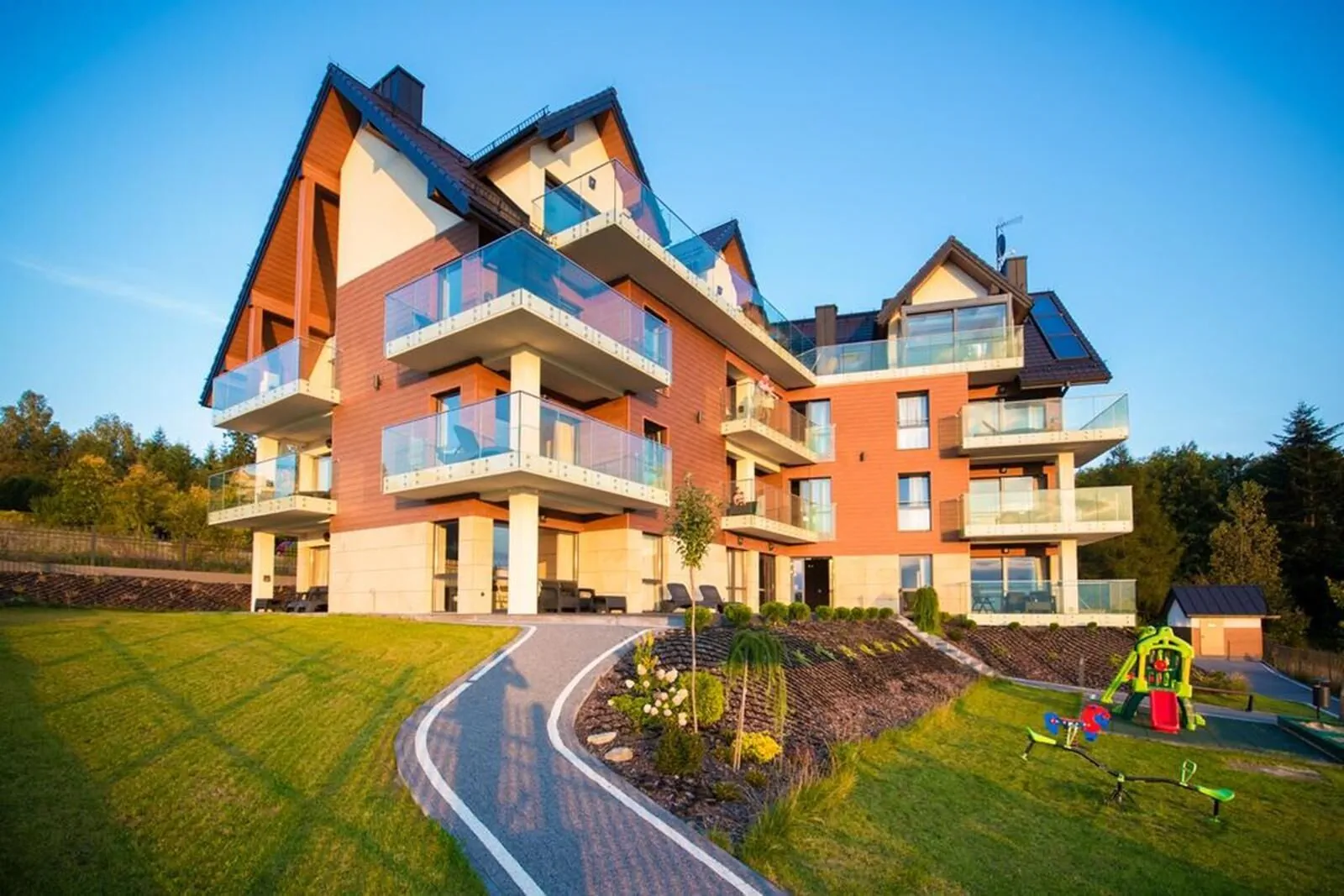 Cały budynek apartamentów Czorsztyn Górski Eden nieopodal Szczawnicy utrzymany jest z jednej strony w harmonii z klimatem lokalnej zabudowy Czorsztyna, z drugiej zaś najwyższej jakości elementy wykończeniowe, takie jak kamień, szkło czy aluminium nadają mu nowoczesnego i współczesnego charakteru.