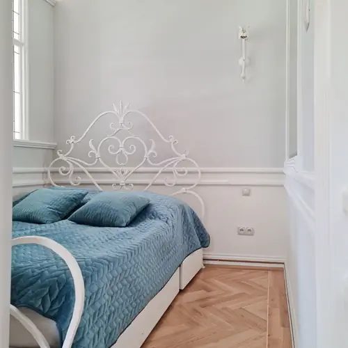 Luksusowe wyposażenie apartamentu wykonane jest z niezwykłą dbałością, wyłącznie z naturalnych materiałów: meble z litego drewna, kowalstwo artystyczne i drewniane stylowe parkiety, szklany witraż. Lokal wykończony elementami sztukaterii gipsowej i naturalnego kamienia.