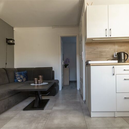 W salonie znajduje się duży narożnik rozkładany, stół z 4 krzesłami oraz w pełni wyposażony aneks kuchenny (naczynia, sztućce i akcesoria kuchenne