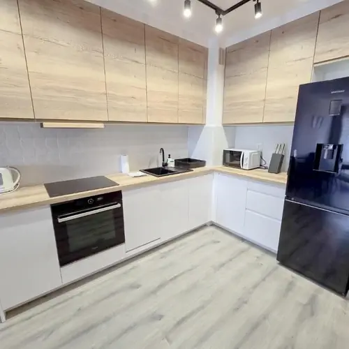 Oferta apartamentu obejmuje sypialnię (1), salon, kuchnię z pełnym wyposażeniem, w tym lodówką i czajnikiem, a także łazienkę (1) z prysznicem oraz suszarką do włosów. W apartamencie zapewniono ręczniki i pościel.