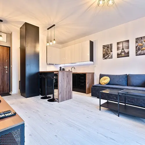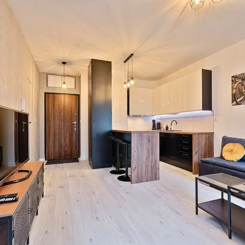 Apartament 2-pokojowy został w pełni zaprojektowany oraz przystosowany do wypoczynku maksymalnie 4 osób dorosłych, składa się z salonu połączonego z aneksem kuchennym, oddzielnej sypialni, łazienki z WC. Wysoki standard wykończenia oraz gustowne dodatki nadają wnętrzu niepowtarzalnego, eleganckiego charakteru. Doskonałe wyposażenie apartamentu obejmuje wszelkie potrzebne meble oraz sprzęty, takie jak: łóżko małżeńskie, rozkładana sofa, krzesła, wyspa kuchenna, ława, TV z płaskim ekranem, lodówka, piekarnik, płyta indukcyjna, zmywarka, czajnik elektryczny, pralka, żelazko, suszarka do włosów, odkurzacz.