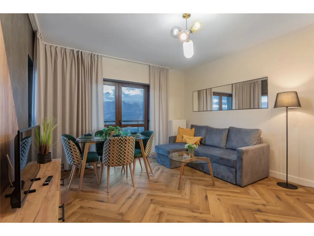 Mieszkanie ma powierzchnię 39 m2 i znajduje się na drugim piętrze. Składa się z salonu z rozkładaną kanapą, tv i aneksem kuchennym wyposażonym w lodówkę, płytę indukcyjną, zmywarkę, mikrofalówkę, czajnik elektryczny, ekspres do kawy przelewowy i niezbędne przybory kuchenne (garnki, sztućce, talerze, szklanki), sypialni z łożem małżeńskim i wc. Apartament posiada balkon z widokiem na góry. Na wyposażeniu jest suszarka do prania, żelazko, suszarka do włosów, pralka i łóżeczko turystyczne.
