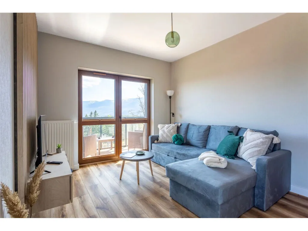 Mieszkanie ma powierzchnię 44 m2 i znajduje się na drugim piętrze. Składa się z salonu z rozkładaną kanapą, tv i aneksem kuchennym wyposażonym w lodówkę, płytę indukcyjną, zmywarkę, mikrofalówkę, czajnik elektryczny, ekspres do kawy przelewowy i niezbędne przybory kuchenne (garnki, sztućce, talerze, szklanki), sypialni z łóżkiem małżeńskim i wc. Apartament posiada balkon z widokiem na góry. Na wyposażeniu jest pralka, suszarka do prania, suszarka do włosów, odkurzacz.