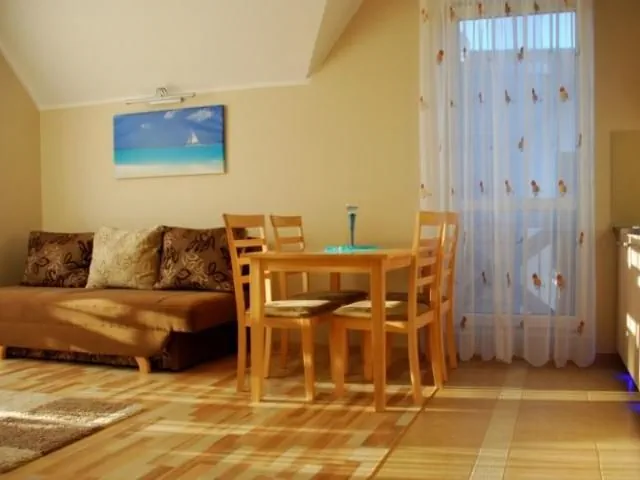 Apartament nasz jest dwu kondygnacyjny zlokalizowany na 1 piętrze. Powierzchnia apartamentu to 40 m2 oraz piętro 34 m2 (skosy). Apartament jest w pełni wyposażony i przygotowany do przyjęcia naszych gości. Na dole znajduje się salon, aneks kuchenny, pokój oraz łazienka z prysznicem i pralką. Na piętrze sypialnia i korytarz.