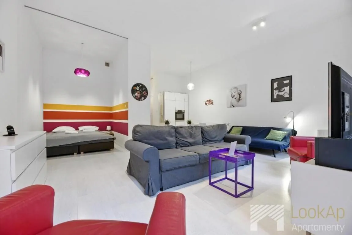 Apartament typu studio został w pełni zaprojektowany i przystosowany do wypoczynku max 4 osób dorosłych, składa się z salonu połączonego z sypialnią i aneksem kuchennym i łazienki z WC. Wysoki standard wykończenia i gustowne dodatki nadają wnętrzu niepowtarzalnego, postindustrialnego charakteru. Wyposażenie apartamentu obejmuje wszelkie potrzebne meble i sprzęty: łóżko małżeńskie, rozkładana sofa, krzesła, stół jadalniany, ława, TV z płaskim ekranem, lodówka, zmywarka, piekarnik, płyta kuchenna, czajnik elektryczny, pralka, żelazko, suszarka do włosów, odkurzacz.