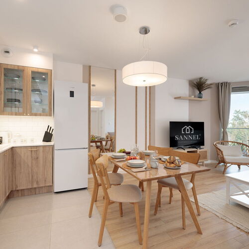 Ten unikalny a zarazem bardzo komfortowy apartament został wyposażony w najwyższej jakości sprzęty oraz umeblowanie. Apartament Lux Sea składa się z salonu z aneksem kuchennym z wydzielonym miejscem do spożywania posiłków, sypialni, garderoby,łazienki oraz dwóch balkonów z widokiem na morze. Salon wyposażony został w sofę z funkcją spania, wygodny fotel, stolik kawowy a także TV z płaskim ekranem z dostępem do kanałów w różnych językach, internetu oraz platform streamingowych. Z tego miejsca udać się można na jeden z dwóch balkonów, na którym znajduje się komplet mebli balkonowych. Aneks kuchenny apartamentu Lux Sea wyposażony został we wszystkie potrzebne sprzęty AGD takie jak toster, czajnik elektryczny, ekspres do kawy, płytę indukcyjną a także akcesoria, potrzebne do przygotowania posiłków.W aneksie umieszczona została również pralko suszarka. Przestronna i bardzo przytulna sypialnia posiada duże łóżko małżeńskie wraz z szafkami nocnymi z lampkami do czytania. Z sypialni apartamentu wyjść można na drugi balkon gdzie znajduje się komplet mebli wypoczynkowych. Z tego miejsca delektować się można pięknym widokiem na morze. Łazienka wyposażona została w przestronny prysznic z odpływem liniowym, umywalkę z blatem i szafką, podświetlane lustro oraz toaletę. W apartamencie znajduje się także oddzielna garderoba z dużą ilością miejsca do przechowywania.