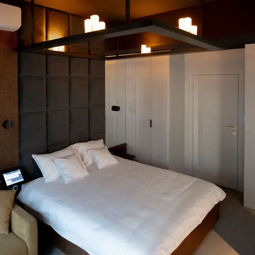 Apartament wyróżnia się najwyższym poziomem izolacji akustycznej, co zapewniają trójszybowe okna, tłumiki akustyczne w systemie wentylacji oraz zewnętrzne ściany budynku obłożone naturalnym kamieniem. To połączenie skutecznie redukuje hałas miejski, gwarantując spokojny i komfortowy wypoczynek.