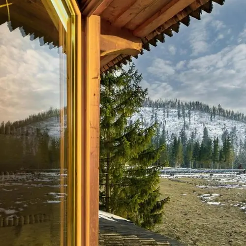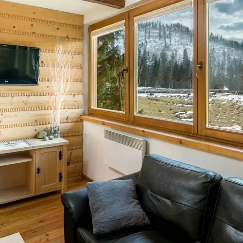 Apartament Przy Dolinie 1 to luksusowy dwupokojowy apartament o powierzchni 47. m2 urządzony w wyszukanym, góralskim stylu. W jego skład wchodzi sypialnia z łożem małżeńskim, szafa i komoda. Salon, który może pełnić rolę pokoju gościnnego jest wyposażony w skórzaną kanapę dla dwóch osób, .42.. calowy telewizor, ławę i komodę. Kuchnia i łazienka wyposażone są według najnowszych trendów, dzięki czemu komfort odczuwany przez domowników jest jeszcze większy. W jadalni znajduje się drewniany stół wraz z krzesłami. Meble w całym mieszkaniu są drewniane, ręcznie rzeźbione. Dodatkowe dekoracje nawiązują do Podhala i nadają góralski klimat. Z okien apartamentu rozciera się piękny widok na Tatrzański Park Narodowy. Standard mieszkania z pewnością zadowoli nawet najbardziej wymagających gości.