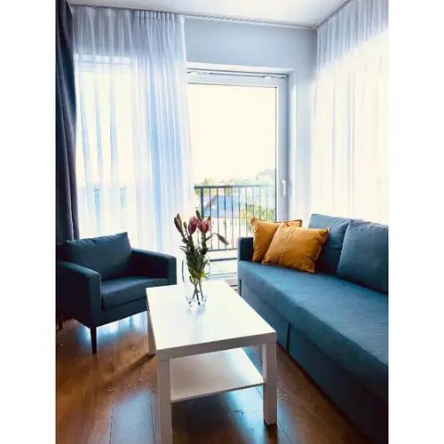 Apartament posiada do 7 miejsc noclegowych. Dla naszych gości przygotowaliśmy salon z wypoczynkiem i płaskim TV, otwartą kuchnią z jadalnią, mającą na celu wspólny odpoczynek i spożywanie posiłków. Dwie sypialnie, każda wyposażona jest w jedno podwójne łóżko i jedno podwójne piętrowe łóżko. Ponadto z salonu i sypialń jest wyjście na balkon. Kuchnia jest w pełni wyposażona w zmywarkę do naczyń, lodówkę, płytę indukcyjną wraz z piekarnikiem, czajnik elektryczny. Łazienka z wc, prysznic, pralka, świeże ręczniki, pościel.