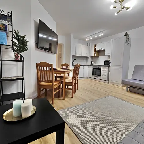 W salonie są 2 rozkładane kanapy, stół+4 krzesła, stolik kawowy. Aneks kuchenny wyposażony jest w dużą lodówkę, mikrofale, piekarnik, płytę elektryczną, toster, opiekacz , blender, czajnik garnki, sztućce, naczynia i drobne przybory kuchenne.