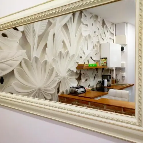 Apartament wykończony nowocześnie i stylowo, elementy ścian zdobi żywy mech. W samym obiekcie znajdziecie Państwo wszystko, co potrzebne podczas wyjazdu: telewizor z płaskim ekranem połączony z wifi (netflix), rozładana kanapa w salonie, duże łóżko dwuosobowe. Na wyposażeniu kuchni znajduje się pełen aneks kuchenny (lodówka, płyta indukcyjna, patelnie, garnki, talerze, kubki, szklanki, ekspres do kawy, mikrofalówka, żelazko). Łazienka znajduje się na półpiętrze w apartamencie(zejście drewnianymi schodami), a w niej kabina prysznicowa, szafki na kosmetyki, czy ręczniki, oraz osobna toaleta. Na terenie obiektu jest stabilne połączenie WIFI.