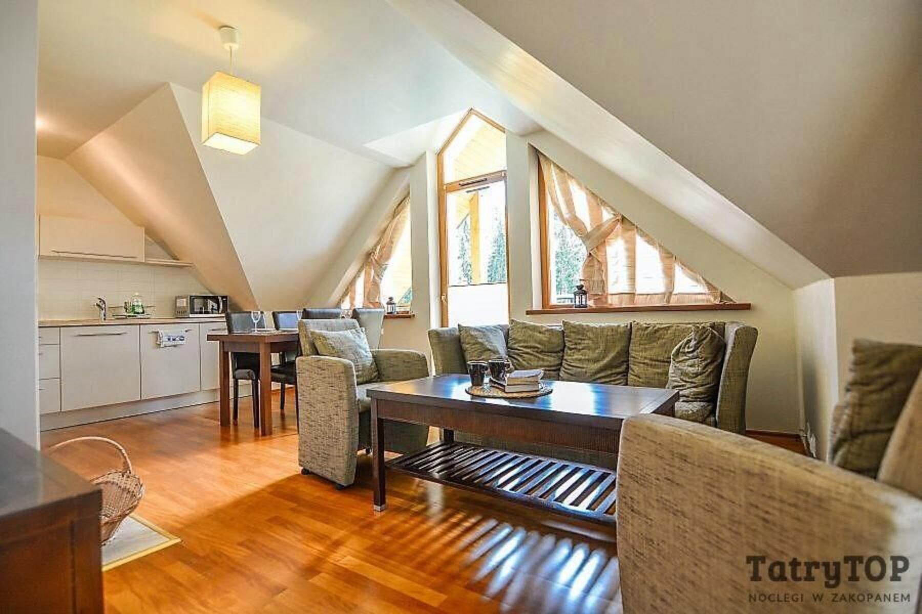 Budynek w którym znajduje się apartament położony jest w pięknej, zacisznej części Zakopanego, na stokach Gubałówki. Jest otoczony zielenią i gwarantuje spokojny wypoczynek. Jednak blisko stąd do centrum Zakopanego. Do dolnej stacji kolejki na Gubałówkę można dojść w mniej niż 10 minut. 10 minut zajmie spacer do Krupówek. Podobnie 10 minut zajmie dojście na stok na Szymoszkowej i do tamtejszego basenu termalnego. Do dworców PKP i PKS można dojść w 20 minut, podobnie w rejon skoczni narciarskiej. Jako ze budynek jest nieco na uboczu, w poszukiwaniu sklepów czy restauracji będzie trzeba przejść się 10 minut, ale będąc wtedy w rejonie Krupówek znajdzie się ich bez liku. Nie można zapominać o leżącym po drodze targu pod Gubałówką gdzie turysta może znaleźć wiele interesujących rzeczy.