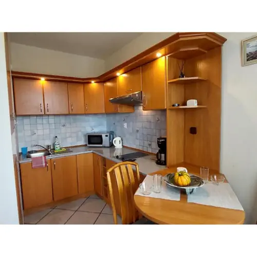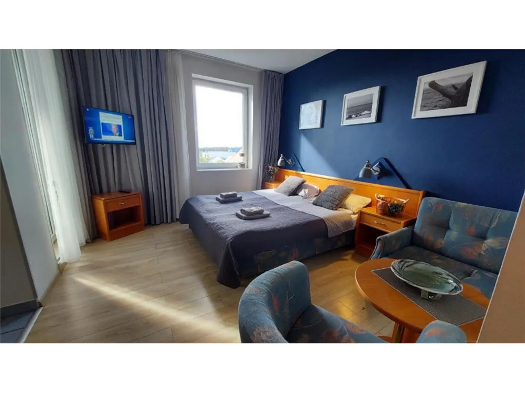 W apartamencie czeka duże łoże dla pary (210x180 cm) oraz rozkładany fotel dla trzeciej osoby. Całości dopełnia wyposażony aneks kuchenny (m. in. mikrofalówka i przelewowy ekspres do kawy), część jadalna oraz łazienka.