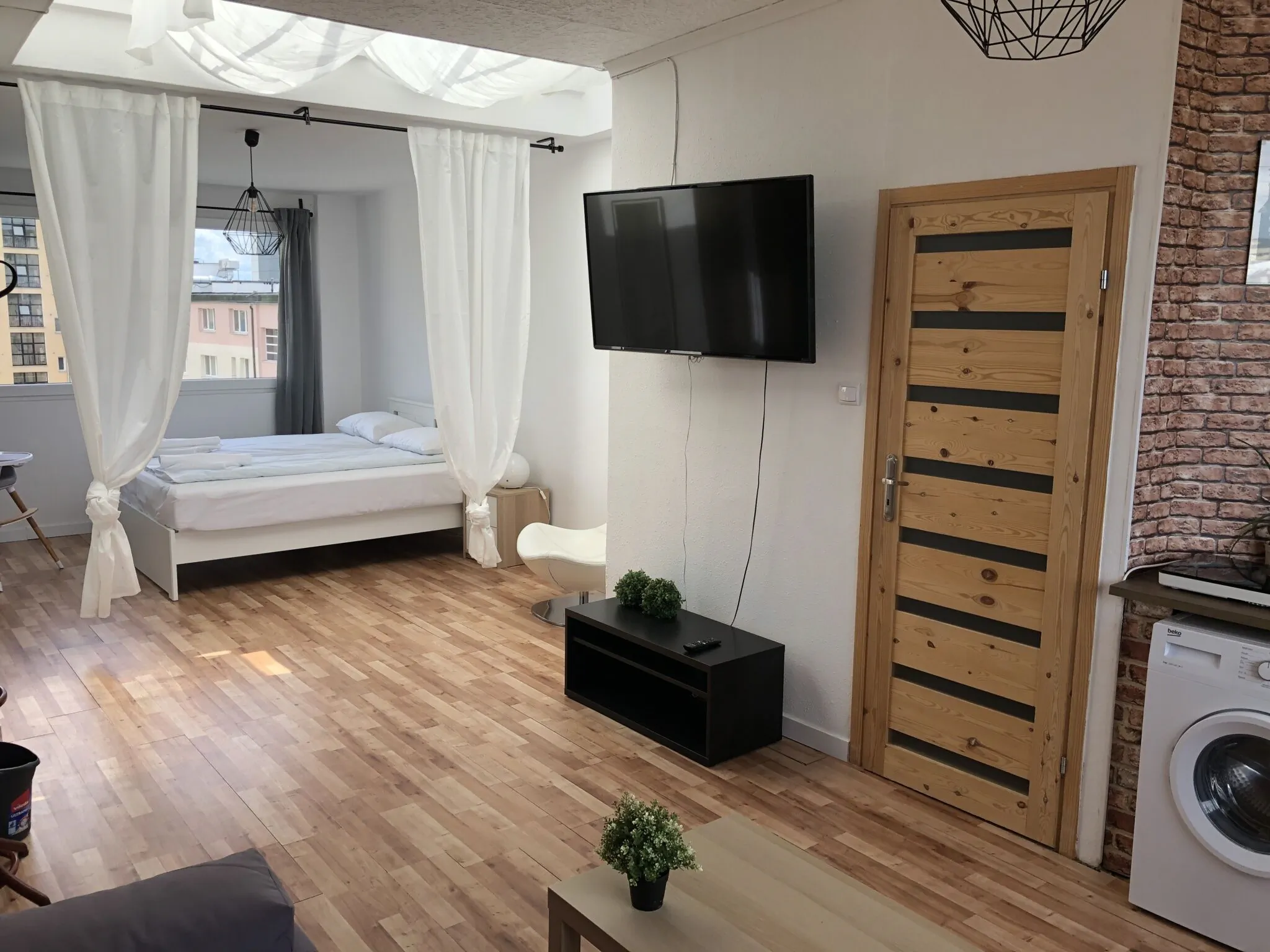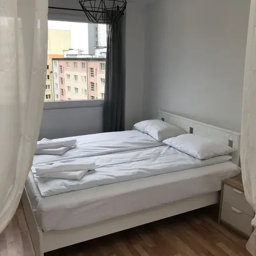 W części dziennej znajduje się rozkładana sofa dla dwóch osób oraz część jadalna ze stołem barowym i krzesłami. W części sypialnej znajduje się komfortowe łóżko małżeńskie. Łazienka jest wyposażona w prysznic i toaletę. Balkon skierowany jest na stronę zachodnią z widokiem na całe centrum miasta.