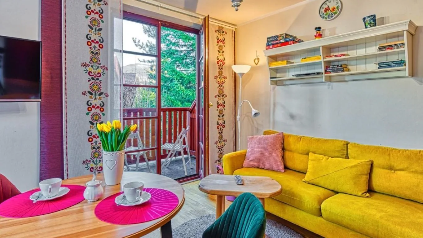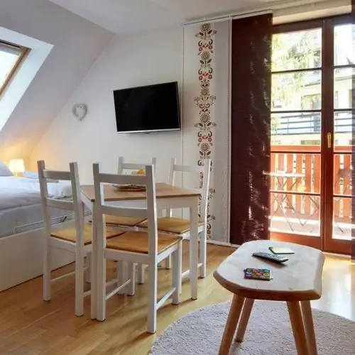 Do dyspozycji gości jest SMART TV, stół i cztery krzesła. Komfortowi pobytu sprzyja przytulny, klimatyczny wystrój wnętrza.