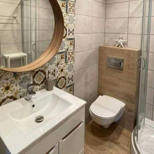 Apartament jest wyposażony w aneks kuchenny, łazienkę z prysznicem, salon z tv stelitarną i kanapą rozkładaną, oraz sypialnię.