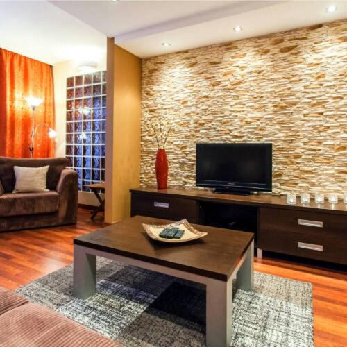 Salonu, w którym znajduje się duża rozkładana 2-osobowa sofa, duży wygodny fotel, TV LCD, TV SAT, DVD, radio oraz domofon otwierający drzwi zewnętrzne,