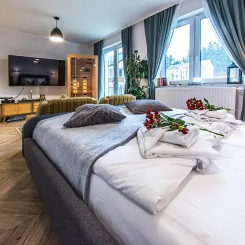 Elegancki i wygodny apartament zaprojektowany tak, by sprostać oczekiwaniom nawet najbardziej wymagających gości. Retro Deluxe z sauną to apartament 2-pokojowy o powierzchni 48 m2. Jest położony na trzecim piętrze budynku z windą, przeznaczony dla maksymalnie 4 osób.