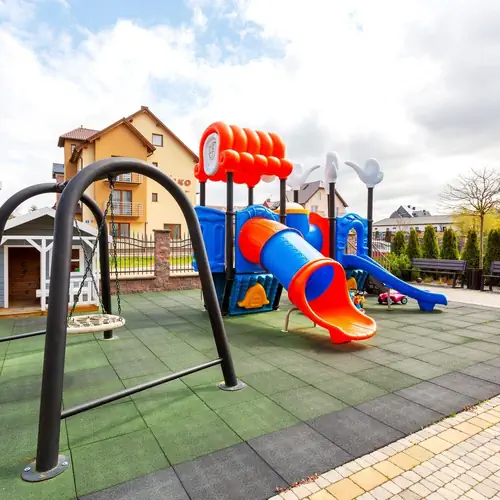 Na terenie obiektu przygotowano liczne udogodnienia dla dzieci, w tym salę zabaw oraz zewnętrzny plac zabaw, które zapewniają bezpieczną i radosną rozrywkę. Dorośli mogą natomiast zrelaksować się w ogrodzie z tarasem i miejscem do grillowania, idealnym na spokojne wieczory.