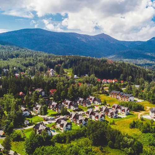 Apartamenty przy ulicy Komuny Paryskiej położone są w spokojnej i pięknej dzielnicy Karpacza, w bliskim sąsiedztwie iglastego lasu. Z obiektu rozpościera się piękny widok na Śnieżkę - najwyższy szczyt Karkonoszy. Jest to lokalizacja idealna dla osób szukających ciszy i spokoju. Bliskość przyrody pozwoli na chwilę relaksu i wytchnienia. Domki są oddalone od siebie, co zapewnia naszym Gościom prywatność.