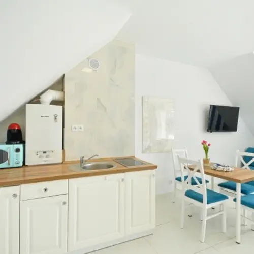 ************************ Apartament to jeden duży pokój z aneksem kuchennym, łazienką i balkonem od południowej strony. Znajdujemy się przy głównej ale spokojnej ulicy, wieczorem i nocą nawet nie jeżdżą tu auta. Malutki kameralny obiekt. Apartament na I piętrze.