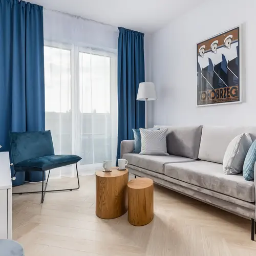 Stylowy apartament zlokalizowany jest w nowej inwestycji o wysokim standardzie "Baltic Marina Residence" przy ulicy Bałtyckiej w Kołobrzegu. Baltic Marina Residence zapewnia luksusowe warunki do spędzenia wakacji nad morzem oraz wiele ekskluzywnych udogodnień, takich jak reprezentatywne lobby z recepcją, podziemny parking, sala fitness, sauna oraz taras z jacuzzi. Jednocześnie jasna, marynistyczna bryła budynku doskonale wpisuje się w otoczenie: w bezpośrednim sąsiedztwie znajduje się marina i port jachtowy na Wyspie Solnej. Do morza, widocznego z okien rezydencji, można dojść krótkim spacerem przez zieleń parku. Centrum Kołobrzegu, pełne restauracji serwujących nadmorskie specjały, oddalone jest od budynku zaledwie o 1 km. Najbliższy supermarket znajduje się w odległości 600 m od Baltic Marina Residence, co pozwala na szybkie zaspokojenie codziennych potrzeb zakupowych. Bliskość dworca kolejowego i przystanków komunikacji miejskiej sprawia, że lokalizacja jest dogodnie skomunikowana.