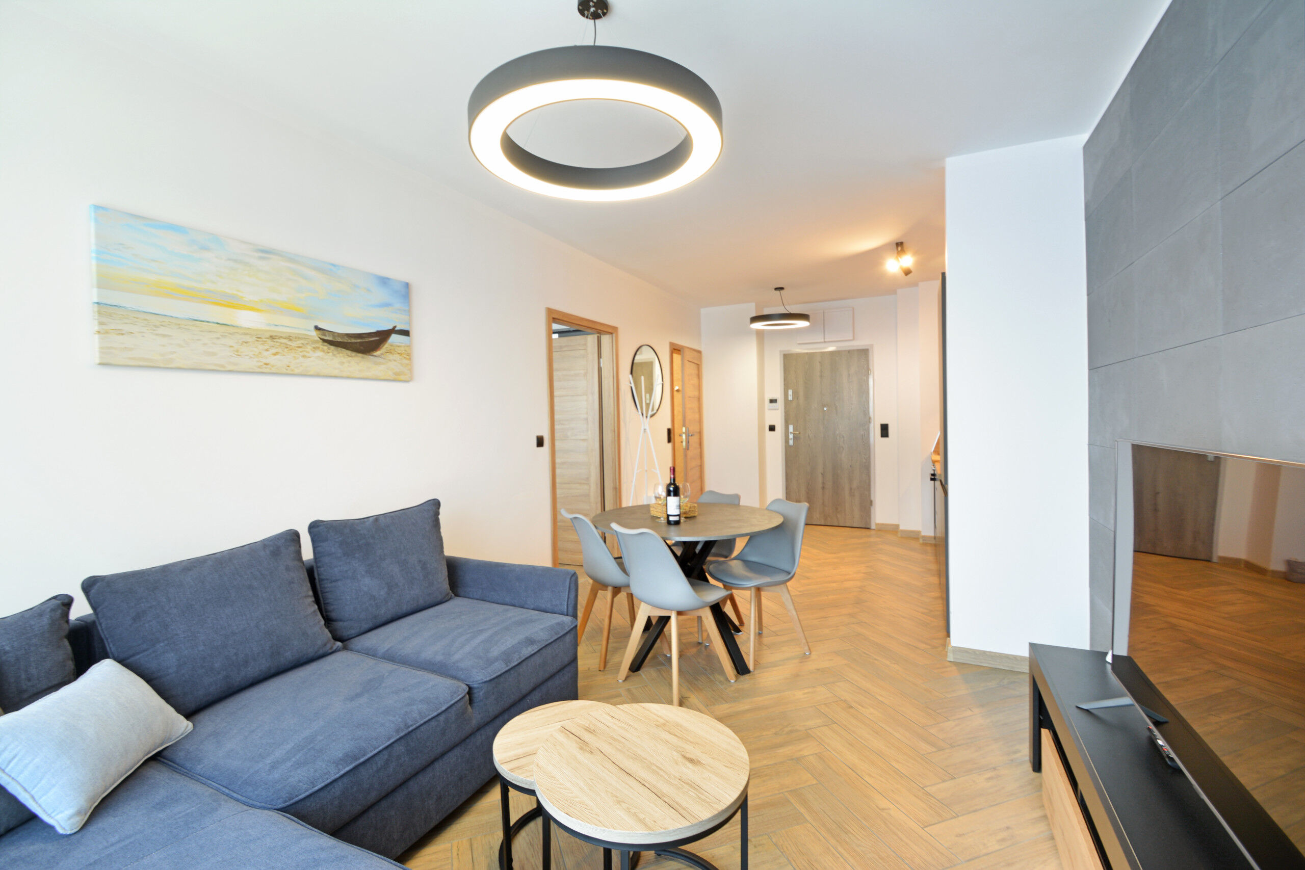 Ten stylowo zaaranżowany apartament jest przeznaczony dla czterech gości. W salonie stoi rozkładana sofa dwuosobowa, a także stoliki, przy których można usiąść, aby zrelaksować się, pijąc poranną kawę lub oglądając telewizję. Dostępny jest tu również jadalniany stół z krzesłami idealny do spożywania oraz serwowania posiłków. Lokal jest wyposażony w jedną sypialnię – odwiedzający dysponują tutaj wygodnym łóżkiem dwuosobowym, a także pojemną szafą, w której można schować posiadane przedmioty. Funkcjonalnie zaplanowana kuchnia, w której znajduje się między innymi piekarnik, lodówka z zamrażarką i przelewowy ekspres do kawy, pozwala na proste przyrządzanie wyśmienitych dań oraz przekąsek. Miłośnicy wypoczynku na powietrzu mogą wyjść z salonu na umeblowany balkon, aby oderwać się na moment od swoich zadań. Łazienka została wyposażona w prysznic, pralkę i suszarkę do włosów. Apartament znajduje się na trzecim piętrze, na które można dostać się windą. Przytulny, a jednocześnie elegancki wystrój sprawia, że jest to doskonałe miejsce na wypoczynek. Warto przyjechać tu zarówno wtedy, gdy uczestniczy się w podróżach o charakterze biznesowym, jak i w sytuacjach, kiedy planowana jest wycieczka rekreacyjna z przyjaciółmi.