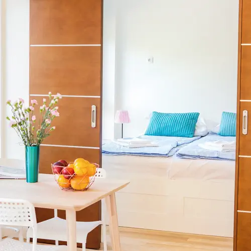 W pełni wyposażone mieszkanie z balkonem przeznaczone jest dla 4 osób. Apartament składa się z pokoju dziennego z aneksem kuchennym, sypialni oraz łazienki z prysznicem. Swobodny i stylowy wystrój z zachwycającymi detalami dekoracyjnymi i domowymi eleganckimi meblami tworzą jasną i przytulną przestrzeń, która jest gwarancją poprawy nastroju. Wyposażenie jest również bardzo praktyczne: obejmuje niewielką przestrzeń do pracy, miejsce do wypoczynku przed telewizorem oraz podwójne łóżko za przesuwanymi drzwiami. To miejsce, do którego chętnie wraca się po całym dniu relaksu na plaży. Kontynuację tego relaksu zapewnia wiele nowoczesnych udogodnień, takich jak szybka sieć Wi-Fi, telewizor z płaskim ekranem i dostępem do kanałów polskich i niemieckich oraz niezbędne urządzenia łazienkowe i kuchenne (suszarka do włosów, ekspres do kawy, toster). Rodzice podróżujący z małymi dziećmi mogą, na życzenie, otrzymać łóżeczko dziecięce i krzesełko do karmienia dla maluchów (50 PLN/doba). W razie potrzeby goście mogą zarezerwować prywatne miejsce parkingowe w garażu podziemnym (30 PLN/doba).