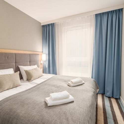 Starannie zaprojektowane wnętrze apartamentu jest odpowiednie dla 4 osób - idealny na pobyt nad morzem z rodzina czy przyjaciółmi. Przestrzeń obiektu oferuje salon z aneksem kuchennym, sypialnię oraz łazienkę z prysznicem. Wnętrze zachęca nowoczesną, a jednocześnie przytulną, atmosferą dzięki dobrze dobranej kolorystyce zawiązującej do nadmorskiego otoczenia apartamentu ze stylowymi dodatkami. Część dzienna z wygodną sofą i telewizorem typu Smart TV, to doskonałe miejsce do odpoczynku i relaksu. W sypialni znajduje się łóżko małżeńskie oraz pojemna szafa. Nawet wewnątrz apartamentu goście mogą cieszyć się nadmorską atmosferą relaksując się na tarasie ( lub balkonie w Apartamencie z balkonem) – idealny na odpoczynek w ciepłe, letnie wieczory. Dla większego komfortu naszych Gości salon Apartamentu jest klimatyzowany (Apartament z Balkonem). Szeroki wachlarz udogodnień oraz kompleksowe wyposażenie apartamentu w niezbędne akcesoria i sprzęty kuchenne (ekspres do kawy, mikrofala, toster, zmywarka, płyta indukcyjna) jak i łazienkowe (suszarka do włosów) gwarantuje komfort pobytu. Multimedia obejmują bezpłatne łącze internetowe Wi-Fi oraz telewizor z płaskim ekranem – świetnie sprawdzi się na wieczorne seanse filmowe. Na dobry początek każdego pobytu zapewniony jest bezpłatny zestaw kosmetyków, ręczniki i pościel. Wysublimowana aranżacja apartamentu oraz wysokiej jakości wyposażenie gwarantują pobyt na najwyższym poziomie. Rodzice podróżujący z dzieckiem mają także możliwość rezerwacji łóżeczka dla swojej pociechy.