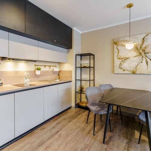 Lodówka z zamrażarką, ekspres do kawy (przelewowy), zmywarka, kuchenka mikrofalowa, toster, zestaw sztućców i naczyń, płyta indukcyjna, przybory kuchenne, czajnik elektryczny, szklanki, kubki, garnki, patelnia, kieliszki do wina, pralka