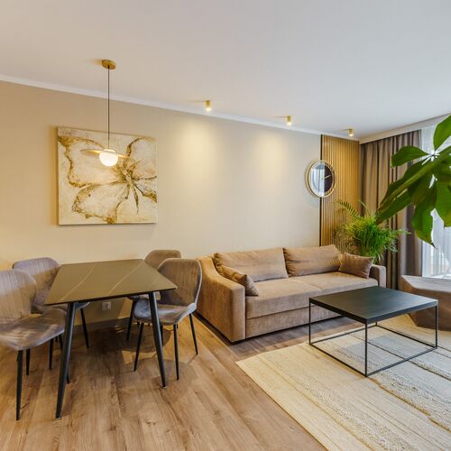 Rozkładana sofa, stolik kawowy, TV, stół z krzesłami, wyjście na balkon
