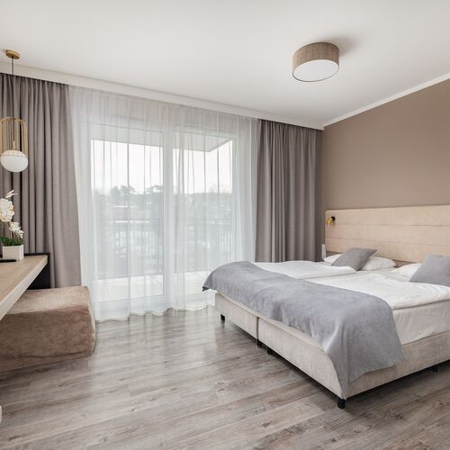 Łóżko podwójne, TV, biurko, szafa, wyjście na balkon, stół z krzesłami
