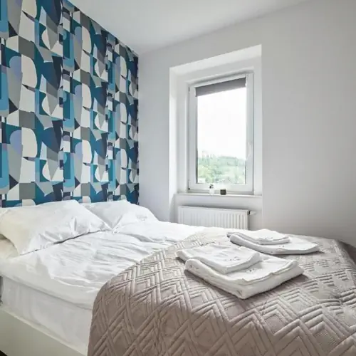 Sypialnia wyposażona jest wygodne łóżko o wymiarach 140x200 cm, a w salonie do dyspozycji jest nowoczesna sofa z funkcją spania która po rozłożeniu oferuje wygodny sen dla dwóch osób (140x200 cm spanie). Dodatkowo lokal doposażono w składane łóżko polowe na którym zmieści się dorosła osoba (90x200 cm spanie) i do rozłożenia w salonie.