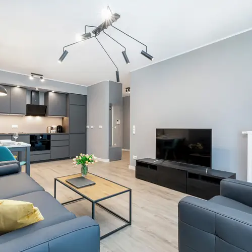 Jedna z sypialni jest wyposażona w duże łóżko, w drugiej znajduje się rozkładana sofa i szafa. W salonie jest jeszcze jedna rozkładana sofa i wyjście na balkon. Mieszkanie posiada w pełni wyposażoną kuchnię - znajdują się tam takie udogodnienia, jak piekarnik, zmywarka, ekspres do kawy. Goście mogą również korzystać z szybkiego Wi-fi oraz telewizji w salonie.