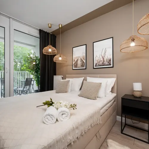W tym w pełni wyposażonym apartamencie może wygodnie mieszkać do 4 osób. Funkcjonalnie zaaranżowana powierzchnia 33m² podzielona jest na salon z podwójną rozkładaną sofą, aneks kuchenny, sypialnię z podwójnym łóżkiem oraz łazienkę z kabiną prysznicową. Oba pokoje mają również wyjście na przytulny prywatny balkon wyposażony w meble ogrodowe, idealny do delektowania się poranną filiżanką kawy w promieniach słońca. Wnętrza charakteryzują się ponadczasową, a zarazem nowoczesną elegancją dzięki wystrojowi, który w gustowny sposób łączy zgrabne meble z ciepłymi, drewnianymi detalami. Szeroki wachlarz udogodnień zaspokaja wszystkie potrzeby gości. Udogodnienia obejmują multimedia (telewizor SmartTV z płaskim ekranem i kanałami telewizji kablowej oraz bezpłatny dostęp do sieci Wi-Fi), a także wszystkie niezbędne urządzenia gospodarstwa domowego (m.in. pralka, zmywarka, ekspres do kawy, sprzęt do prasowania). Aby ułatwić rozpoczęcie każdego pobytu, zapewniono bezpłatny zestaw kosmetyków, ręczniki i pościel.