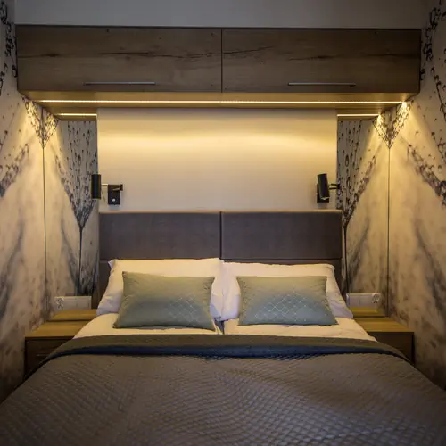 Podwójne łóżko, pościel, stoliki nocne, szafki
