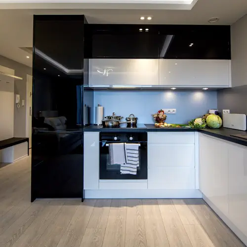 Czajnik elektryczny, płyta indukcyjna, piekarnik, lodówka, ekspres do kawy, zmywarka, komplet naczyń, przybory kuchenne, stół z krzesłami