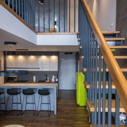 Ten nowoczesny, dwupoziomowy apartament może ugościć do 4 osób - jest to idealny wybór na rodzinny wyjazd lub dla grupy przyjaciół. Wysoce funkcjonalna przestrzeń składa się z salonu z aneksem kuchennym, sypialni na piętrze, łazienki z prysznicem i osobnej toalety. Część dzienna wyposażona w wygodną sofę oraz telewizor Smart TV stanowi doskonałe miejsce odpoczynku i relaksu. Do dyspozycji gości są także dwa balkony z meblami ogrodowymi (w salonie, w sypialni), z których rozciąga się przepiękny widok na wiślańskie góry – idealne miejsce na łyk porannej kawy, czy odpoczynek po całym dniu zwiedzania. Drewniane, ale zarazem lekkie schody prowadzą do przytulnej sypialni z komfortowym, wielkim łożem małżeńskim - gwarancja wygodnego odpoczynku po aktywnie spędzonym dniu. Goście mają do dyspozycji szybki i bezpłatny Internet Wifi. Szeroki wachlarz udogodnień oraz kompleksowe wyposażenie apartamentu w niezbędne akcesoria i sprzęty kuchenne, jak i łazienkowe gwarantuje komfort pobytu. Dla ułatwienia rozpoczęcia każdej wizyty zapewniono bezpłatny zestaw kosmetyków (mydło, szampon i żel pod prysznic), ręczniki oraz pościel. Na wyposażeniu mieszkania goście znajdą również pralkę, co z pewnością docenią rodziny z małymi dziećmi czy osoby planujące dłuższy pobyt. O komfort temperatury w pomieszczeniach zadba dostępna klimatyzacja. Wnętrze mieszkania charakteryzuje się połączeniem nowoczesności i luksusu. Apartament jest funkcjonalnie zaprojektowany, wychodząc naprzeciw wszelkim potrzebom gości. Istnieje możliwość, aby zabrać na wyjazd swojego ulubionego pupila, gdyż obiekt akceptuje zwierzęta.