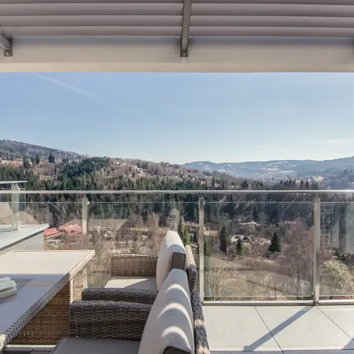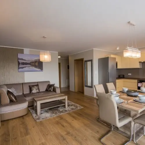 Ten przytulny i tradycyjny apartament ma dwie sypialnie i znajduje się na trzecim piętrze budynku. Jest on przeznaczony dla czterech osób. Wnętrze urządzone jest z wykorzystaniem ciepłych odcieni brązu i beżu. To świetne miejsce do wypoczynku dla osób pracujących zdalnie, rodziców z dziećmi, par i znajomych organizujących wspólne wycieczki. Lokal dysponuje umeblowanym balkonem, z którego można podziwiać wspaniałe górskie krajobrazy oraz okoliczną zieleń. W jednej z sypialni znajduje się duże i wygodne łóżko dwuosobowe, a także pojemna szafa, w której można schować posiadane rzeczy. Druga sypialnia została natomiast wyposażona w dwa pojedyncze łóżka. W salonie stoi rozkładany narożnik, stolik idealny do pracy zdalnej i jadalniany stół z krzesłami. W pomieszczeniu zlokalizowane jest też lustro i telewizor z dostępem do kanałów naziemnych. Posiłki można przygotowywać w praktycznie wyposażonym aneksie kuchennym, w którym umieszczono między innymi piekarnik, toster, ekspres do kawy oraz kuchenkę mikrofalową. W łazience dostępny jest prysznic, powitalny zestaw kosmetyków i suszarka do włosów. W apartamencie znajduje się też pralka oraz klimatyzacja. Zmotoryzowani goście mogą skorzystać z podziemnego miejsca postojowego.