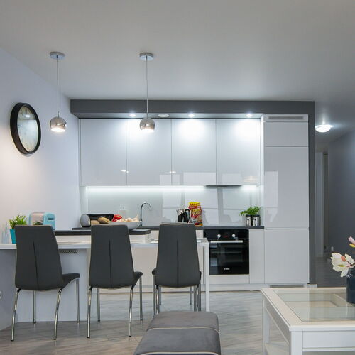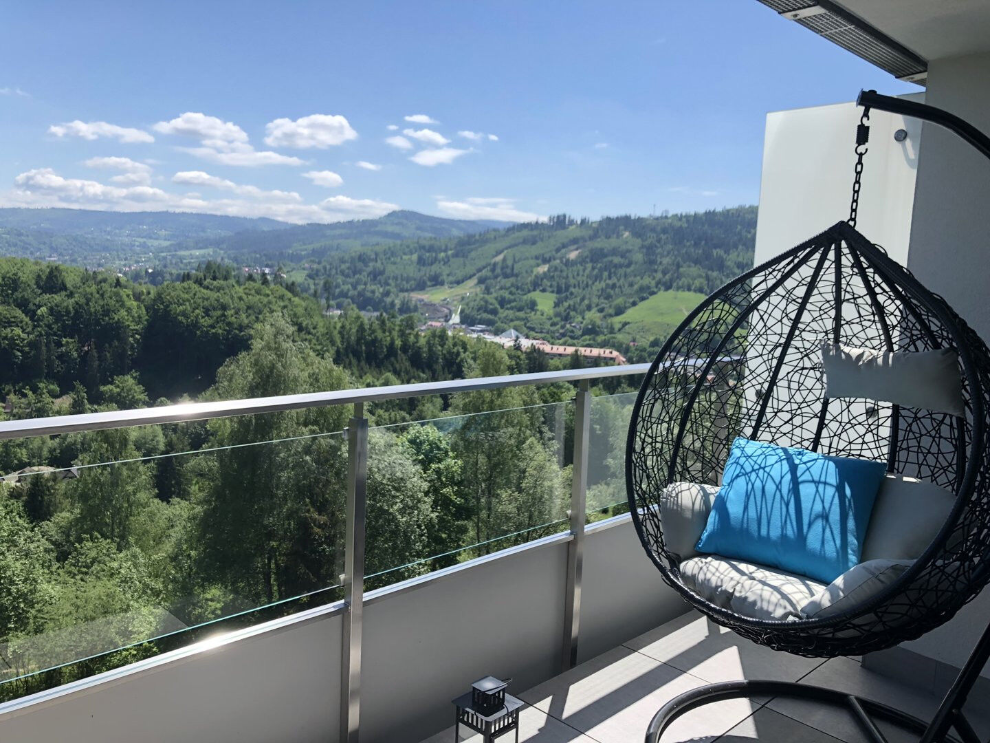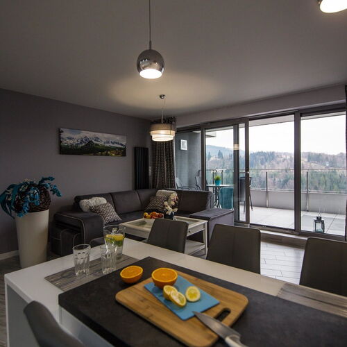Stylowy apartament mieści się na pierwszym piętrze i oferuje nocleg aż dla 6 osób. Jest to idealna opcja dla dużych rodzin lub podróżujących wspólnie grup. Wnętrze jest nowoczesne, eleganckie i przestronne, a kolorystyka opiera się na bieli, szarościach i błękitach. Do dyspozycji Gości pozostają aż dwie sypialnie. W pierwszej z nich mieści się podwójne łóżko małżeńskie typu kingsize, natomiast w drugiej dwa łóżka pojedyncze. Dodatkowe miejsce noclegowe stanowi podwójna rozkładana sofa znajdująca się w salonie. Przygotować pyszny posiłek dla całej rodziny można za pomocą znajdującej się w aneksie kuchennym płyty indukcyjnej, kuchenki mikrofalowej lub piekarnika. Nie należy martwić się zmywaniem naczyń, ponieważ dostępna jest także zmywarka. Podczas cieplejszego dnia warto napić się zaparzonej w ekspresie kawy na przynależącym do apartamentu balkonie, z którego rozpościera się piękny widok na góry i fragment miasta Wisła. Łazienka wyposażona jest w prysznic, pralkę oraz ręczniki, a specjalnie na powitanie Gości przygotowano bezpłatny zestaw kosmetyków (szampon, żel pod prysznic, mydło). Apartament posiada dostęp do wszelkich udogodnień multimedialnych, m.in. szybkiego połączenia WiFi oraz telewizora z płaskim ekranem i dostępem do telewizji naziemnej. Do apartamentu przynależy miejsce parkingowe na parkingu zewnętrznym.