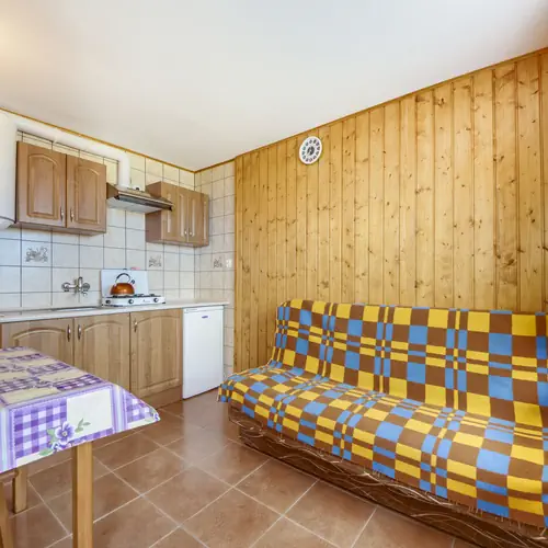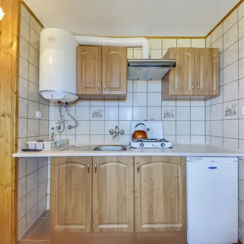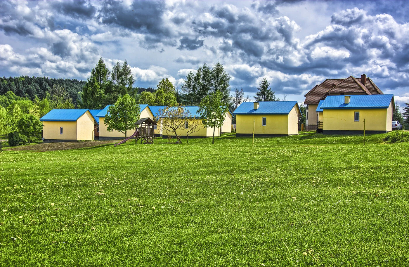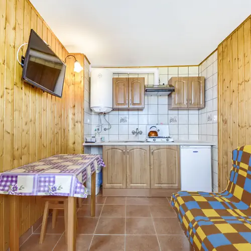 Domki czteroosobowe posiadają aneksy kuchenne wyposażone w naczynia i sprzęt kuchenny. Natomiast domki sześcioosobowe posiadają osobną kuchnię z jadalnią, także w pełni wyposażone są w sprzęt kuchenny i naczynia. Każdy domek wyposażony jest w TV. Do dyspozycji każdego domku osobne miejsce parkingowe. Cały teren wokół domków (około 1 hektar) jest ogrodzony. Jest to idealne rozwiązane dla Państwa pociech i zwierząt, które będą miały gdzie się wyszaleć.