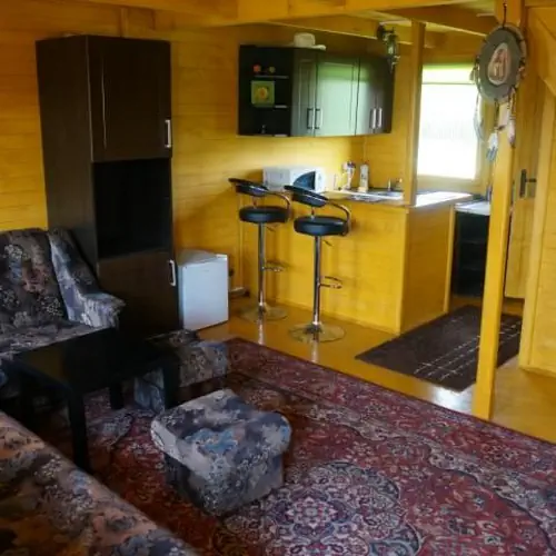 Domek holenderski wyposażony w aneks kuchenny (umywalka, lodówka, czajnik, mikrofala) toaletę, sypialnię z łożem małżeńskim i pokój dzienny (z dwuosobową wersalką).