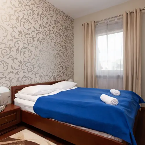 W pełni wyposażony apartament może wygodnie pomieścić 4 osoby - jest idealny zarówno na weekendowe wypady, jak i dłuższe pobyty. Apartament składa się z pokoju dziennego z aneksem kuchennym, oddzielnej sypialni oraz łazienki z prysznicem. Salon posiada wyjście na prywatny balkon z widokiem na wewnętrzną stronę osiedla, co zapewnia poczucie ciszy i spokoju. Wnętrze ma ciepłą, domową atmosferę. Wystrój opiera się na przytulnych meblach z ciemnego drewna i jasnych dekoracyjnych tapetach. Pełen zakres udogodnień, w tym pełne wyposażenie kuchenne i łazienkowe, gwarantuje wysoki komfort każdego pobytu. Multimedia obejmują telewizor z płaskim ekranem oraz bezpłatny bezprzewodowy dostęp do Internetu. Na dobry początek każdego pobytu zapewniony jest bezpłatny zestaw kosmetyków, pościel i ręczniki. Goście podróżujący samochodem mogą zaparkować bezpłatnie na dostępnych miejscach parkingowych na terenie ogrodzonego osiedla.